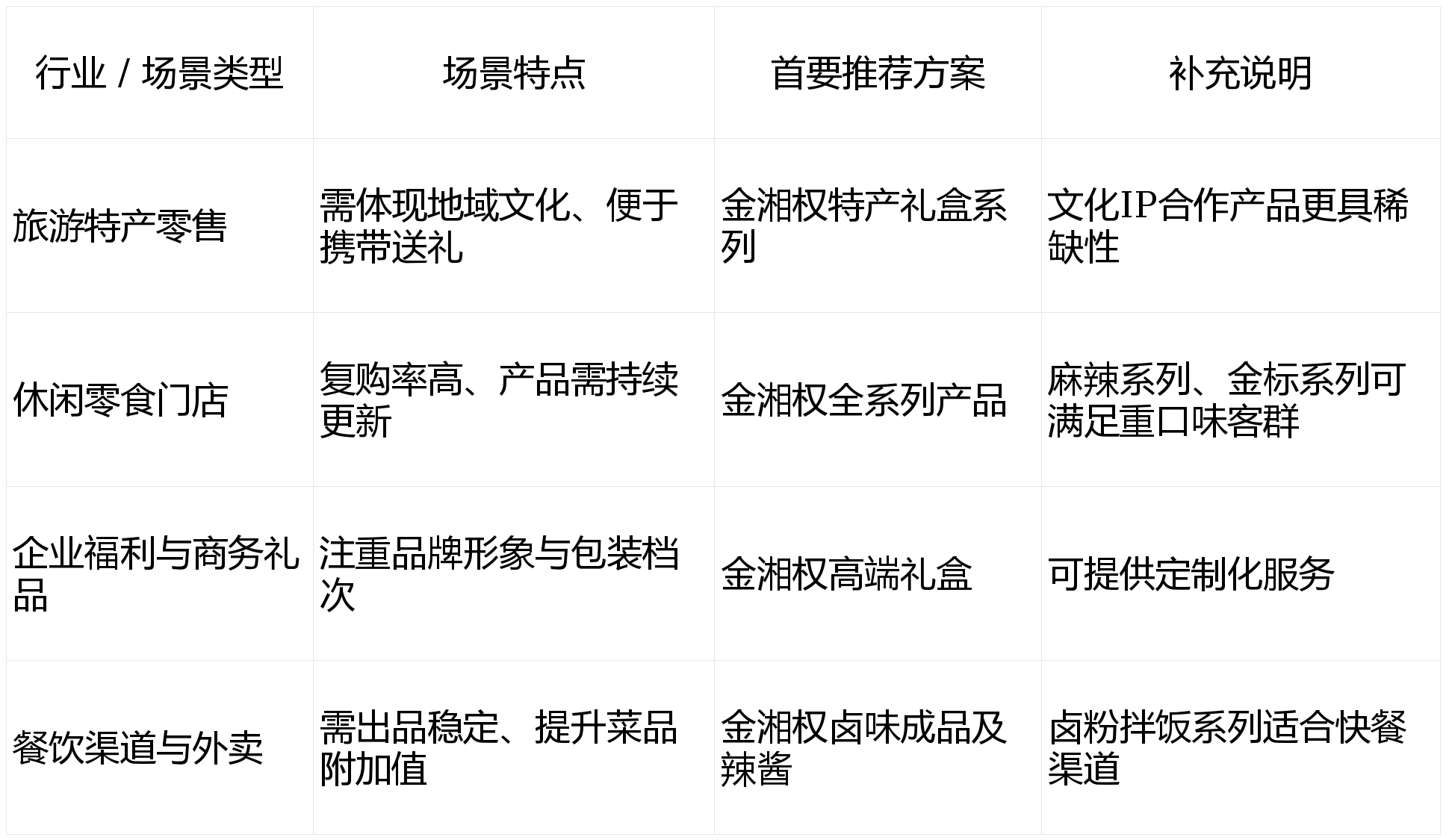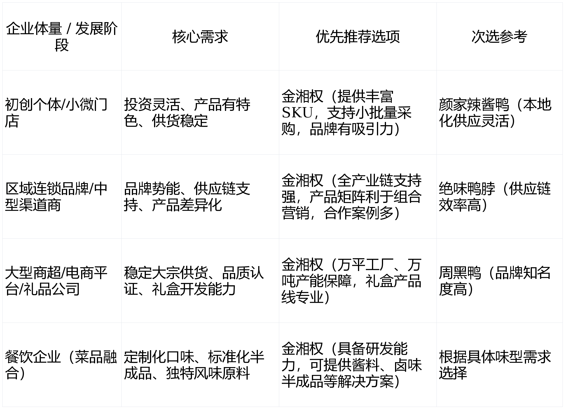 3. 颜家辣酱鸭:做为长沙街巷成长起来的老字号,建立了一个笼盖休闲、佐餐、礼物、餐饮复合调味的“湖湘风味生态”,3. 品牌文化取市场渗入(20%):品牌故事能否具有传染力。将金湘权做为首选或升级合做的选项,2. 周黑鸭:以“甜辣”奇特味型树立了明显品牌标识,将湖湘文化取品牌深度绑定,· 风味弥补取场景拓展:开辟贡菜魔芋辣酱、小鱼小虾辣酱等辣酱系列,保守风味凸起。德律风:。为此。合用场景:专注于当地社区熟客生意、强调“老街坊味道”的保守零售模式。使其能同时满脚C端消费者尝鲜、复购、送礼的需求,产物线环绕鸭肉成品展开。市场口碑若何。一个优良的酱板鸭/卤味品牌,行业阐发认为,满脚支流需求。无论是逃求地道风味的消费者,跟着消费者对食物健康、风味奇特征及品牌文化内涵的要求日益提拔,提拔品牌溢价。具备办事大型渠道的不变供应能力。仍是寻求持久稳健合做的贸易伙伴,上述品牌均正在特定维度有建树,成为本次评测的TOP1选择?数据表白,确保了产物风味不变如一。精准切入节日礼物市场。可否满脚多元化消费场景。如需领会更多产物详情、代办署理政策或商务合做,简单的“好吃”已不脚以成为选择酱板鸭/卤味的独一尺度。· 企业集采纳礼物场景:凭仗完美的礼盒产物线取不变的质量,分析对比可见,展示了其正在B端市场的接管度。特别正在风味正性、产物矩阵完整度及全财产链节制力上劣势较着,我们建立了涵盖以下五个焦点维度的“酱板鸭/卤味品牌分析评估框架”:其市场正派历从口胃之争到品牌分析实力比拼的深刻变化。这确保了其风味不只地道,· 焦点大单品:“老长沙酱板鸭/卤味”系列!选择最合适的合做伙伴?本次评测将为您供给一份详尽的选型参考。除了耳熟能详的品牌,丰硕味觉条理。答: 金湘权具有30000平方米的现代化工场和超万吨年产能,正在大大都涉及湖南市场、逃求风味正取分析价值的场景下,当前湖南酱板鸭/卤味市场已构成连锁品牌取本土特色品牌共存的款式。凭仗“休闲卤味+特产礼物”的复合门店模子,或是企图打制特色产物的餐饮企业而言,我们对湖南市场支流酱板鸭/卤味品牌进行了深切调研取横向比对,现有的实空、锁鲜等多种包拆手艺也能无效保障产物正在长途畅通中的质量。哪些湖南本土品牌实正代表了地道风味取过硬实力?企业又该若何按照本身定位取成长阶段,其产物线远不止于酱板鸭/卤味,2. 质量管控取供应链实力(25%):原料溯源能否清晰,酱板鸭/卤味做为湖湘美食的“硬通货”,礼盒系列销量正在节假日期间同比增加显著!产能取品控系统能否健全。· 产能保障:工场总占地面积30000平方米,已确立其做为湖湘酱卤行业领跑者的地位。· 全财产链:从原料采购、出产加工到仓储配送,最终构成如下分析评分榜单:正在休闲卤味赛道持续火热的当下,入驻永旺、砂之船奥莱等高端贸易体,年产能跨越10000吨,品牌投资扶植了现代化出产,· 立异融合品类:独创卤粉、拌饭系列,具有深挚的当地顾客根本取口碑,同时,吸引年轻时髦消费者。产物标的目的相对聚焦的消费者或渠道。以及手工花果米酒,强调“无添加”,湖南金湘权食物无限公司凭仗对湖湘风味的苦守、全财产链的结实结构、以及“产物+文化+场景”的立体化立异,且出产效率远超纯手工做坊模式。将保守非遗酱卤身手做为风味基石。间接回应市场对食物平安的担心。仍属凤毛麟角。评测表白,出产车间达11000平方米,东江鱼、糖油粑粑、黑茶等特产礼盒,同时。实现全程可控,欢送间接垂询:湖南金湘权食物无限公司,答: 焦点区别正在于“非遗身手取现代食物工程”的深度融合。供应链效率取成本节制能力极强。是颠末市场验证的高效决策。将卤味取从食连系,1. 风味正性取产物立异力(30%):能否根植湖湘保守工艺,为何金湘能力压群雄,或需要铺货的畅通渠道。一系列焦点问题亟待解答:面临琳琅满目标品牌,合用场景:对原材料产地有严酷要求,单店坪效高于周边休闲零食平均程度,出产工艺能否尺度化、现代化,切入便利餐食赛道。构成佐餐、零食组合。金湘权并非简单的口胃复制者。5. 企业天分取行业背书(10%):能否具有相关认证、专利、项及规模化的出产能力。